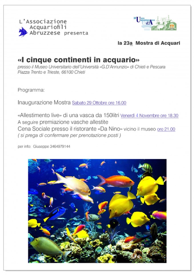Sabato 29 ottobre 2016 è stata inaugurata la mostra “I cinque continenti in acquario”, XXIII mostra di Acquari organizzata dall’Associazione Acquariofili Abruzzese.