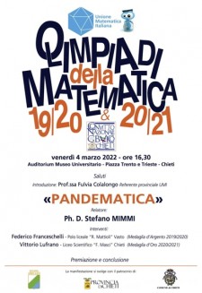 Il pomeriggio prevede la relazone dal titolo "Pandematica", di Stefano Mimmi, che seguirà i saluti di Fulvia Colalongo, referente provinciale Unione Matematica Italiana.